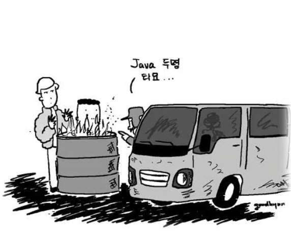 새벽 인력시장 같은 곳에서 자바 개발자 일자리 생겼으니 봉고에 타라고 하는 그런 내용이다.