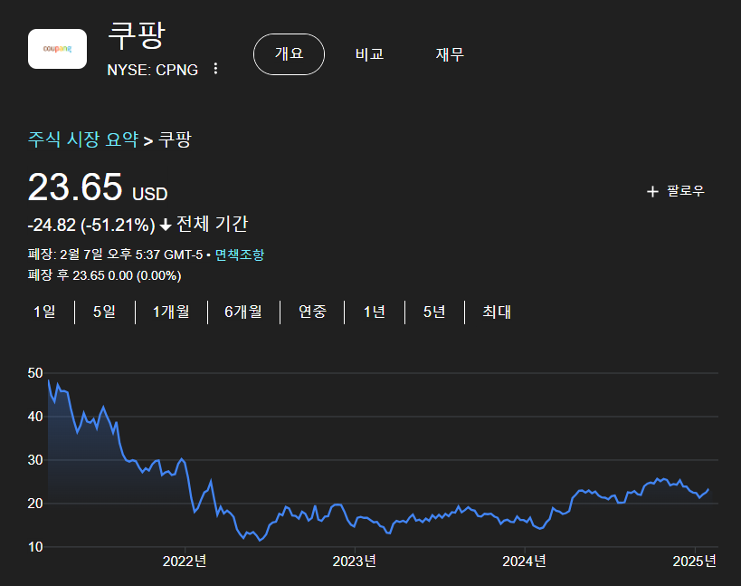 이거는 쿠팡이구요 상장된지 얼마안되서 5년치 차트 입니다.
