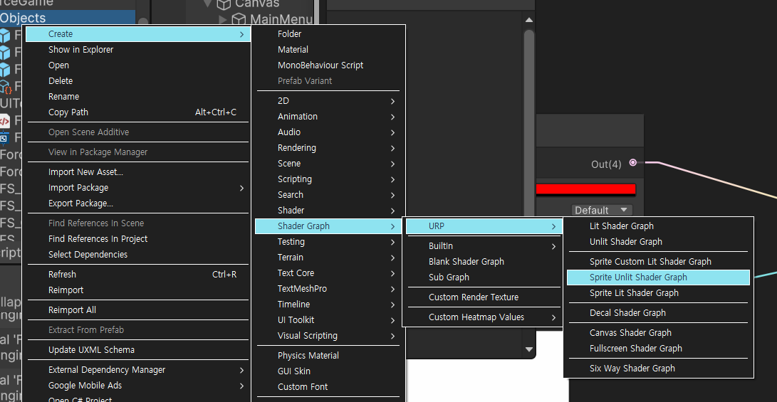 3. 파일쪽에서 우클릭 create -> Shader Graph -> Spirte Unlit ~~ 셰이더 그래프 만듭니다.