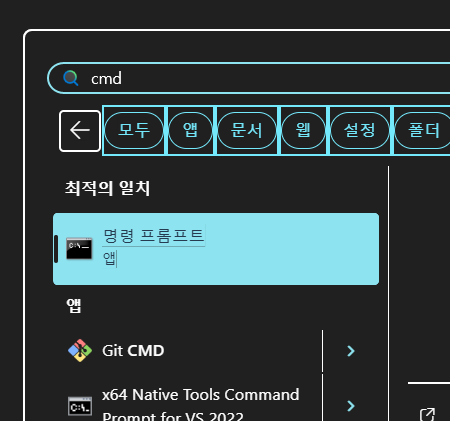 6. 시작버튼을 눌러 cmd 를 입역합니다.