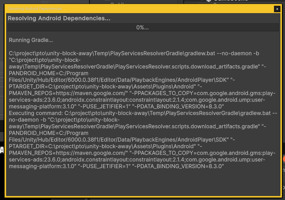 Executing command: C:\project\pto\unity-block-away\Temp\PlayServicesResolverGradle\gradlew.bat --no-daemon -b "C:\project\pto\unity-block-away\Temp\PlayServicesResolverGradle\PlayServicesResolver.scripts.download_artifacts.gradle" "-PANDROID_HOME=C:/Program Files/Unity/Hub/Editor/6000.0.38f1/Editor/Data/PlaybackEngines/AndroidPlayer\SDK" "-PTARGET_DIR=C:\project\pto\unity-block-away\Assets\Plugins\Android" "-PMAVEN_REPOS=https://maven.google.com/" "-PPACKAGES_TO_COPY=cohttp://m.google.android.gms:play-services-ads:23.6.0;androidx.constraintlayout:constraintlayout:2.1.4;com.google.android.ump:user-messaging-platform:3.1.0" "-PUSE_JETIFIER=1" "-PDATA_BINDING_VERSION=8.3.0"resolve 해도 해결이 안되네요