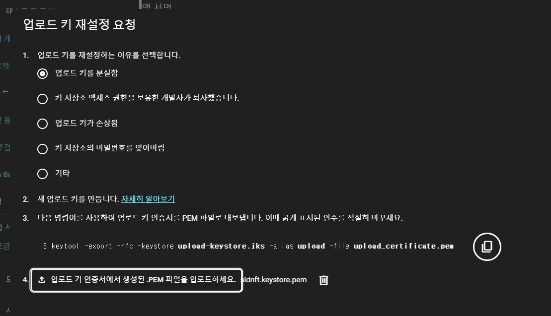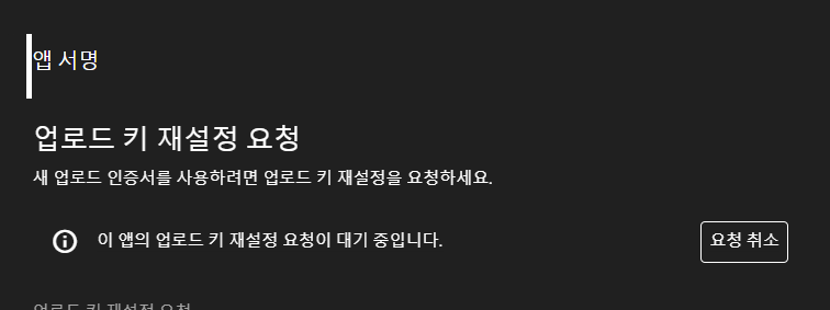 메뉴위치는 앱선택 -> 테스트 및 출시 -> 설정 -> 앱 서명 -> 업로드키 재설 정 요청