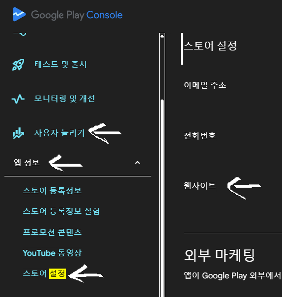 4. 구글 플레이 앱 정보 -> 홈페이지 주소를 등록한다.