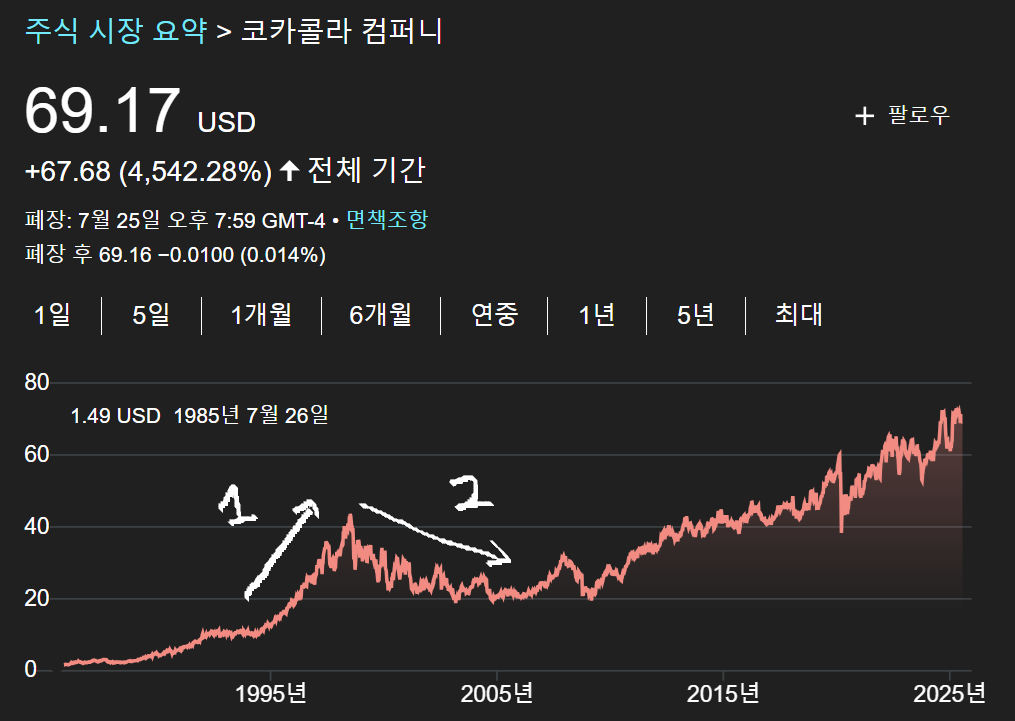 그리고 최고가에서 1/3 토막이 나는 시절도 있었지만 버핏은 팔지 않았습니다.