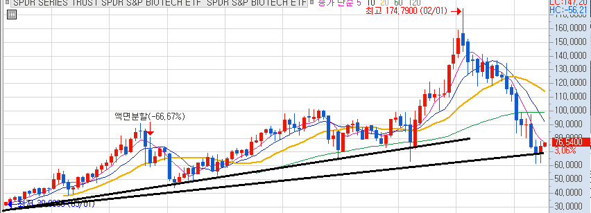 2주만에 $4 에서 $7.5 까지 급등했었네요 (최고점은 어의없는 가격 $169 이긴하군요 ㄷㄷ)1배짜리는 XBI 구요.