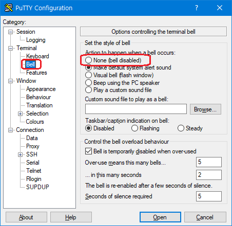 I use Putty to SSH my remote Ubuntu 16.04 server. 1. Putty bell won't ring: I want to ring the Putty bell and tried the dedicated commands for that: echo -e "\07" && echo -e "\007" When I