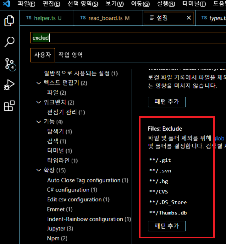 더 전문가적인 방법으로는 vscode 의 파일리스트에서 안보이게 제외하는 방법입니다.