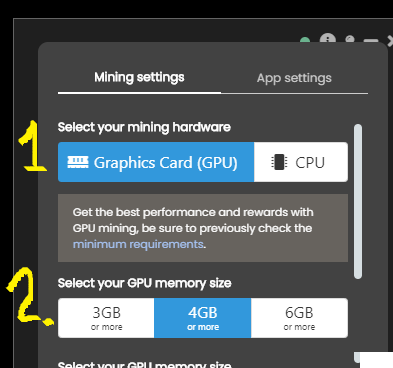 자 이제 채굴화면입니다. 아래의 톱니버튼을 눌러 설정창을 여세요
