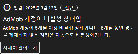 현재상태가 앱은 프로덕션 직전이구요애드몹은 계정이 정지 되었군요 살리는것 부터 해야겠습니다.가입은 간단하니 패스 할께요정지된 내 계정 ㅠㅠ 앱 겁토앱은 프로덕션 가야 검토가 되려나봅니다. 계정 활성화 체크박스3주 정도 지난 시점입니다. 약간의 변화가 있어 기록합니다.제 계정은 오래전에 만든거라 비활성화 상태였고 이제 활상화 하라고 뜨네요콘솔로 들어갈때 자동으로 떳습니다.설명서에는 활성화 하려면 체크박스를 클릭하라고 되어있었는데 창이 뜨지 않아 엄청 해매다 포기하고 있었습니다.그러다 이번에 뜨네요.한참걸린다고 문서에 써줬으면 기다렸을텐데 이거 UI 찾느라 노력했던 시간이 아깝네요아무튼 활성화 버튼 클릭(자내를 주욱 지켜보았네)활성화 한다고 해서 앱이 통과하는건 아닌가봅니다.또 기다림의 시간이 오는군요 ..