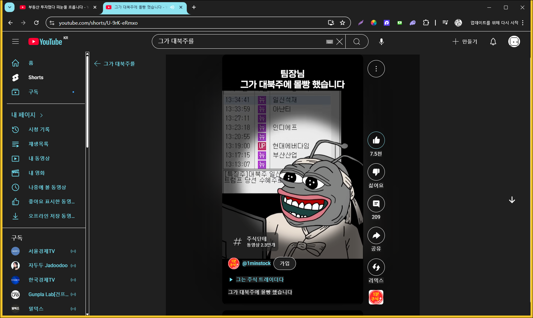 팀장님 그가 대북주를 몰빵했습니다. / 주식 투자 쇼츠 팀장님 그가 대북주를 몰빵했습니다. 영상:https://www.youtube.com/shorts/U-9rK-eRmxo 그전에꺼는팀장님 그가 상따를 했습니다.영상: https://www.youtube.com/shorts/RsoOGYyBMO4 주식 투자엔 많은 교훈이 있습니다.그것은 팀장님의 움직임에 휘둘리지 않도록 해주는 조언입니다.모든 술수를 버티는 것 많이 유일한 해답입니다. 유튜브 2025.08.16